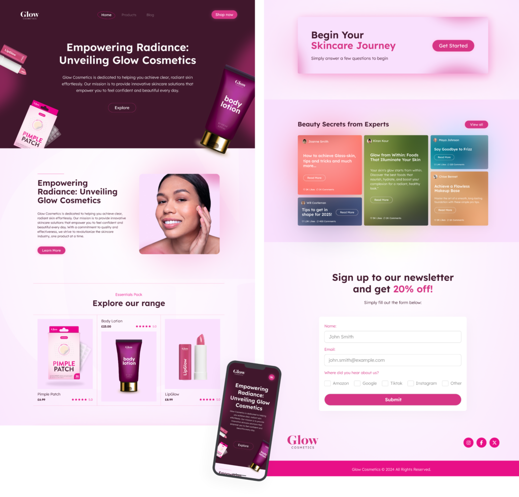 Design a vibrant, luminous landing page for Glow Cosmetics, featuring products, blogs, and an “About Us” section.
